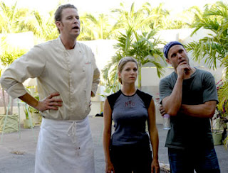 I am not sure who should go, although I think I know who will... C.J. was interviewed recently and, when asked about the quality of the remaining chefs, responded that the remaining group was "pretty tight", and proceeded to give a verbal nod to Hung, Dale, Brian and Casey. Notice that only Howie and Sara's names were missing. He was definitely interviewed long after Howie's departure, but definitely not before it was publicly revealed (tonight) so obviously someone wasn't manning the controls. So before this episode, I knew that either Sara or Howie would be leaving this week, and Sara will go next week. It's unfortunate, in my opinion. I think she's been underrated all along.